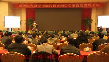 2012年12月13日,寶光股份第四屆供方大會在寶雞東高新區(qū)萬福七星國際酒店隆重召開。寶光集團董事長、黨委書記、寶光股份總經(jīng)理李軍望,寶光股份副總經(jīng)理張軍、袁軍為,財務(wù)總監(jiān)蔣華明,及公司主要職能部門和生產(chǎn)單元相關(guān)單位領(lǐng)導(dǎo)和來自全國各地共81家的180多位供應(yīng)商代表參加了會議。大會由采購部副部長武永澤主持。