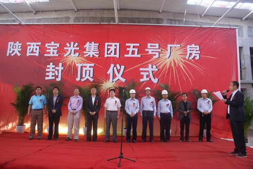 5月29日上午8:30時,建設中的5#廠房施工現場,樂曲激昂,彩旗飄揚,寶光集團5#廠房封頂儀式隆重舉行。一大早,寶光集團領導一行帶著慰問品及消暑品,對施工單位及員工的辛勤付出表示感謝和慰問。5#廠房,去年11月5日開始施工,經過工程項目組、施工單位及監理單位和廣大員工7個多月的艱苦奮戰,順利封頂。西電集團黨委常委佟紹成、寶光集團公司領導李軍望、李明鑫、付宗喜,及股份公司副總經理謝洪濤、陜安分公司副總經理秦東升、陜西中安工程管理咨詢有限公司董事長史建斌,工程項目組、建設單位、施工單位、監理單位等有關人員參加了封頂儀式。