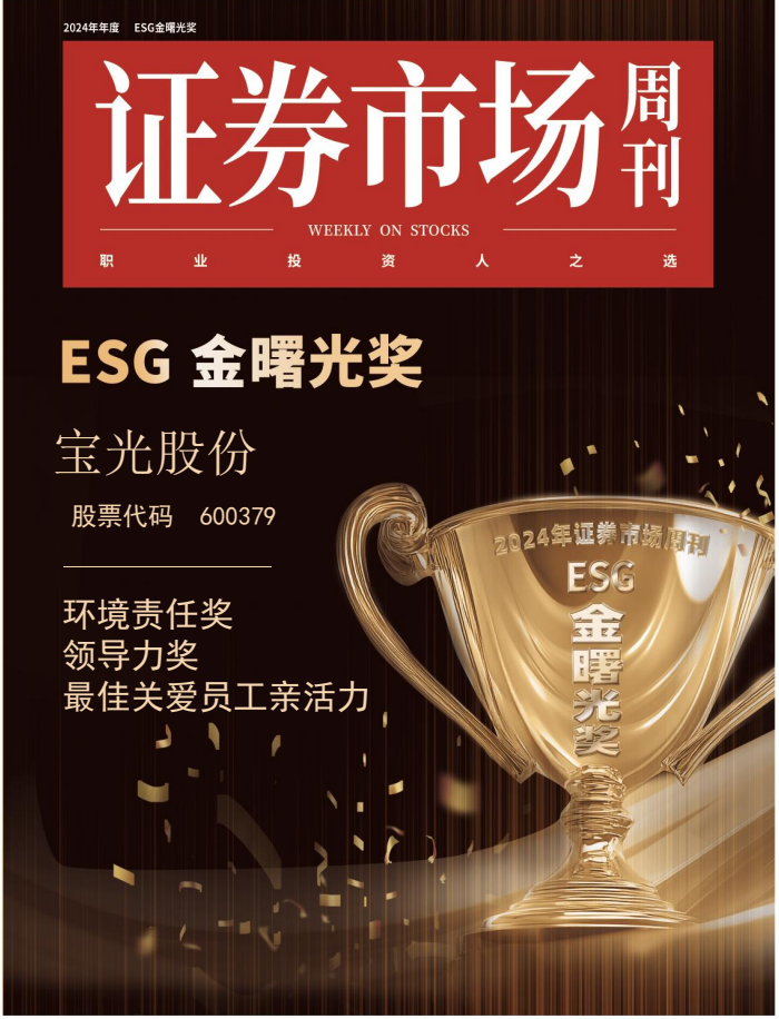 11月23日,2024《證券市場周刊》ESG“金曙光獎”及“十大ESG領先企業榜單”評選結果揭曉。寶光股份憑借在ESG領域的卓越表現,榮獲“金曙光環境責任獎”“十大ESG領先企業—最佳關愛員工親活力獎”,寶光股份黨委書記、董事長謝洪濤榮獲“金曙光領導力獎”。這是對寶光股份及企業“帶頭人”在ESG管理方面(非財務管理方面)高水平表現的高度贊譽,也是對企業在ESG實踐方面持續努力成果的肯定。