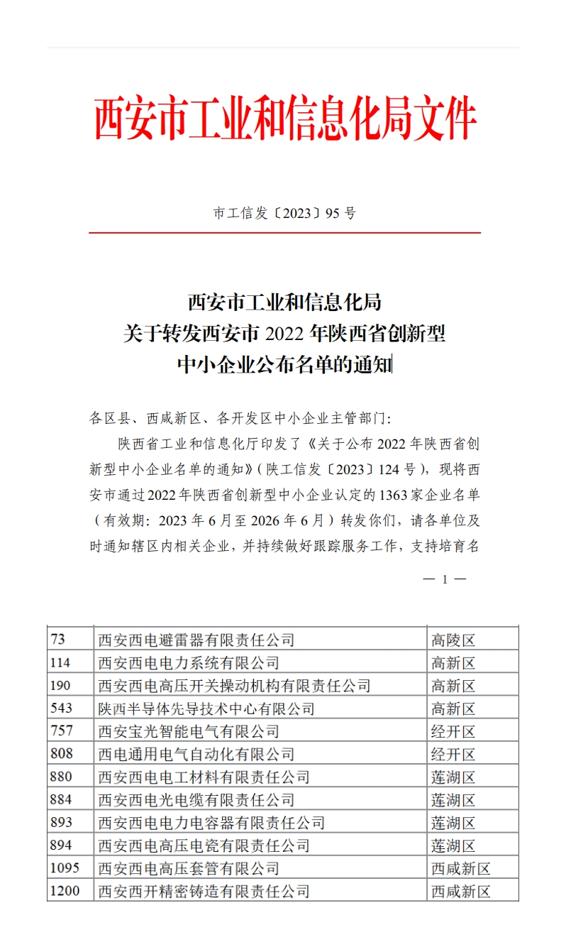 日前,陜西省工信廳印發《關于公布2022年陜西省創新型中小企業名單的通知》,文件公布了《西安市2022年陜西省創新型中小企業名單》,公司所屬西電電力系統、西電套管、西電西容、西電西材、西電光電纜、西電避雷器、西電西瓷、西電操動機構、西電通用、西開鑄造、寶光智能、先導中心成功入選,被認定為2022年陜西省創新型中小企業。