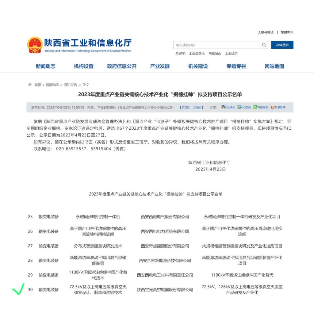 通過(guò)認(rèn)真籌備、資料審核及現(xiàn)場(chǎng)答辯,由公司組織申報(bào)的“72.5kV、126kV及以上高電壓等級(jí)真空滅弧室產(chǎn)品研發(fā)及產(chǎn)業(yè)化”項(xiàng)目與“高鐵車(chē)載開(kāi)關(guān)用真空滅弧室智能化產(chǎn)線(xiàn)建設(shè)”項(xiàng)目分別中榜陜西省工信廳2023年關(guān)鍵核心技術(shù)產(chǎn)業(yè)化“揭榜掛帥”項(xiàng)目與重點(diǎn)產(chǎn)業(yè)鏈發(fā)展項(xiàng)目,并已進(jìn)入公示階段。